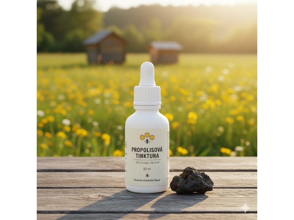 „Silná propolisová tinktura (50 ml) z vlastního propolisu z Vysočiny. Koncentrovaný přírodní prostředek k péči o dásně, drobná poranění a posílení imunity. Ruční výroba s úctou ke včelám.“